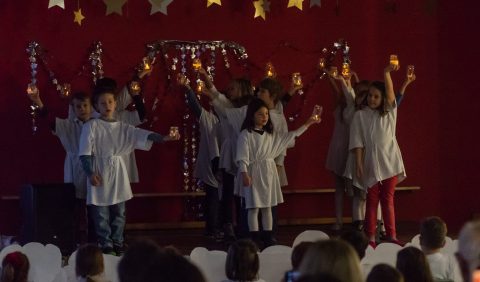Die engagierten Schüler der Klasse 3 eröffneten das Fest mit einem charmanten Gedicht, das das Publikum sofort in ihren Bann zog. In dem anschließend aufgeführten Weihnachtsmusical überzeugten unsere Viertklässler die Zuschauer von ihrer beeindruckenden schauspielerischen Leistung und suchten als Engelschar das diesjährige Weihnachtslied. Die Aufregung und Vorfreude waren spürbar, als z.B. unsere Erstklässler ihr Lied zum Besten gab, die Klasse 2 mit ihrem Lichtertanz eine festliche Stimmung in der Aula schuf oder die Drittklässler mit den vom Musikverein Bergheim gespendeten Cajóns ein beschwingtes Weihnachtslied zeigten. Mit dieser bunten Palette an Darbietungen, die von den Schülern vorbereitet wurden, war es ein sehr gelungener Abend. Rektorin Nicola Tank bedankte sich herzlich bei den Lehrern, Schülern und Eltern für das große Engagement und die großartige Unterstützung. Auch der Elternbeirat trug maßgeblich zum Gelingen des Festes bei und verwöhnte die Gäste in der Turnhalle nach der Aufführung mit kulinarischen Köstlichkeiten. Dort fand traditionell der Weihnachtsbasar und ein Kinderflohmarkt statt. Für den Weihnachtsbasar haben unsere Schülerinnen und Schüler wieder mit tatkräftiger Unterstützung der Eltern allerlei Schönes zur Weihnachtszeit gebastelt. So konnte Weihnachten kommen…