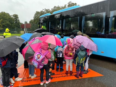 Auch sicheres Schulbusfahren will gelernt sein. Aus diesem Grund fand ein Schulbustraining für die Schulanfänger der Grundschule Bergheim statt, um richtiges Verhalten an der Haltestelle sowie am und im Schulbus zu üben.
