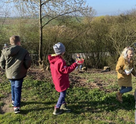 Voller Spannung erwarteten die Kinder den Freitag, den 11.04.2025. Vor der Pause kam dann die Meldung von Fr. Eder aus der 1. Klasse. Der Osterhase wurde aus dem Fenster im Erdgeschoss gesichtet. Alle begaben sich auf die Suche. Auch zwischen den Sträuchern wurde eifrig geschaut, ob ein Nest abgelegt wurde. Jedes Kind fand eine bunte Schale. Darin lag ein hartgekochtes, farbiges Osterei und mehrere schokoladige Leckereien, die liebevoll auf Heu gebettet waren. Na, dann konnten die lang ersehnten Osterferien ja beginnen.